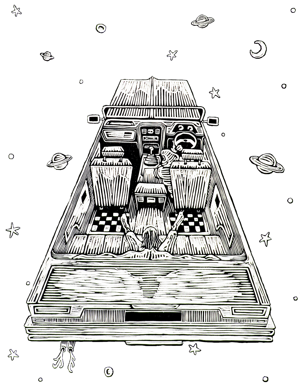 Now he carves those moments into wood, presses them into prints, and lets them live again on what you wear. His work isn’t clean, and it sure as hell isn’t polite – but it’s honest. Every line tells a story. Some from this world, some from galaxies we’ve yet to map.